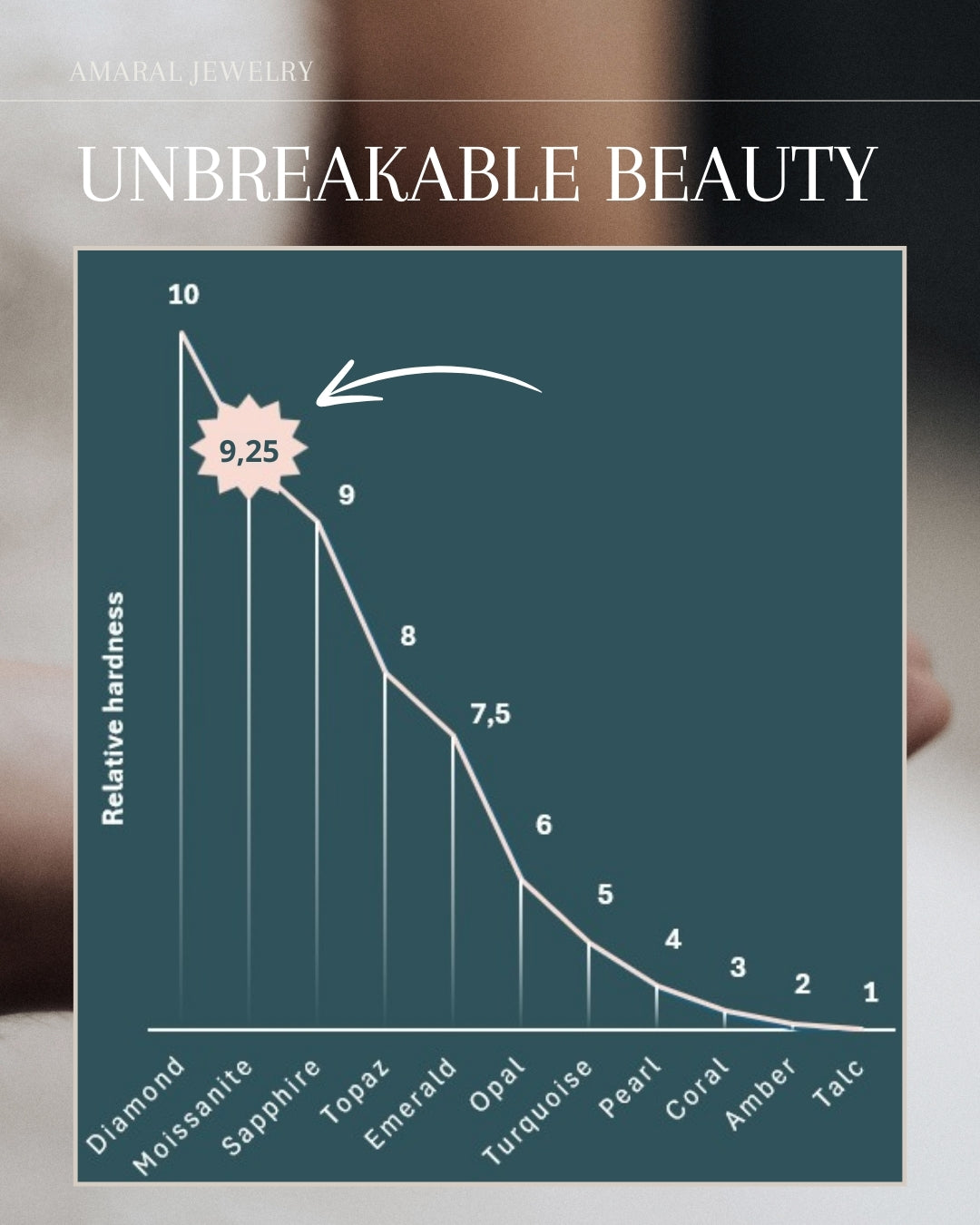Moissaniitti, jonka kovuus on 9,25 Mohsin asteikolla, on lähes yhtä kestävä kuin timantit, mikä tekee siitä täydellisen päivittäiseen käyttöön.