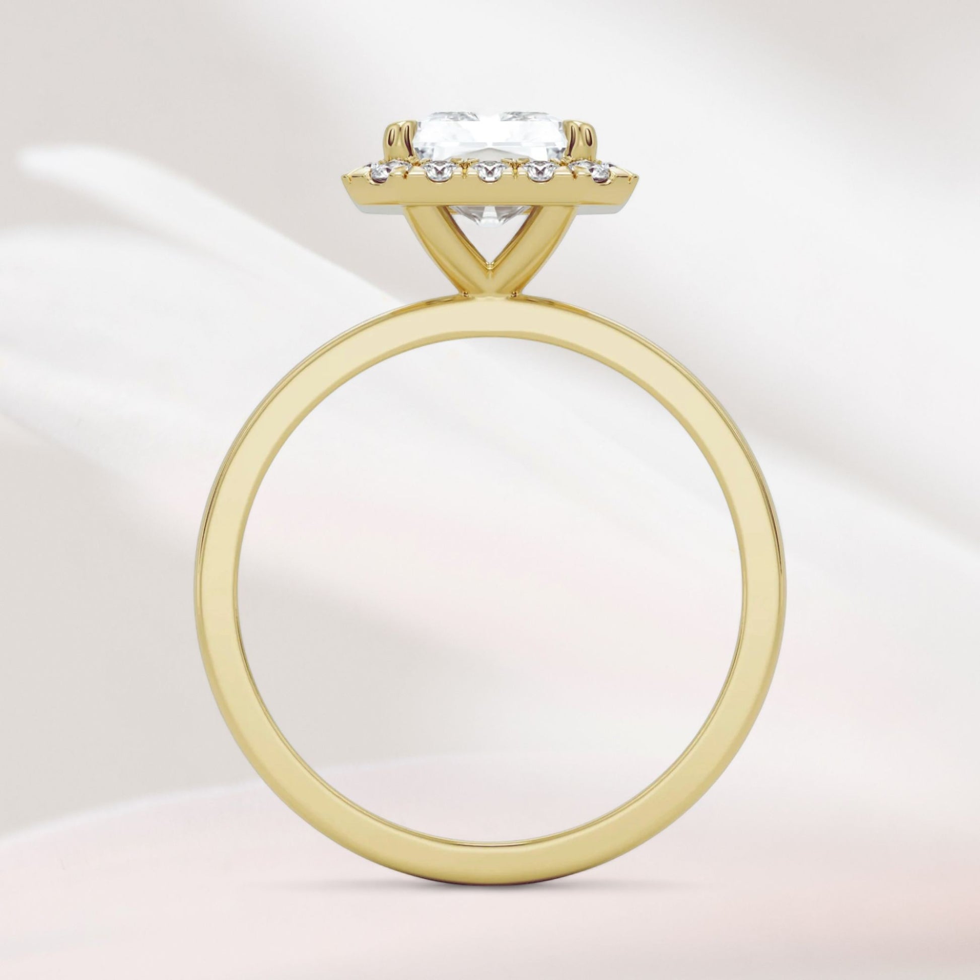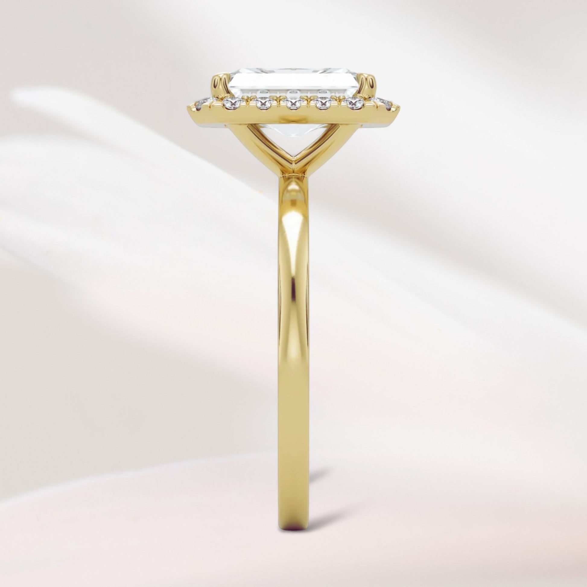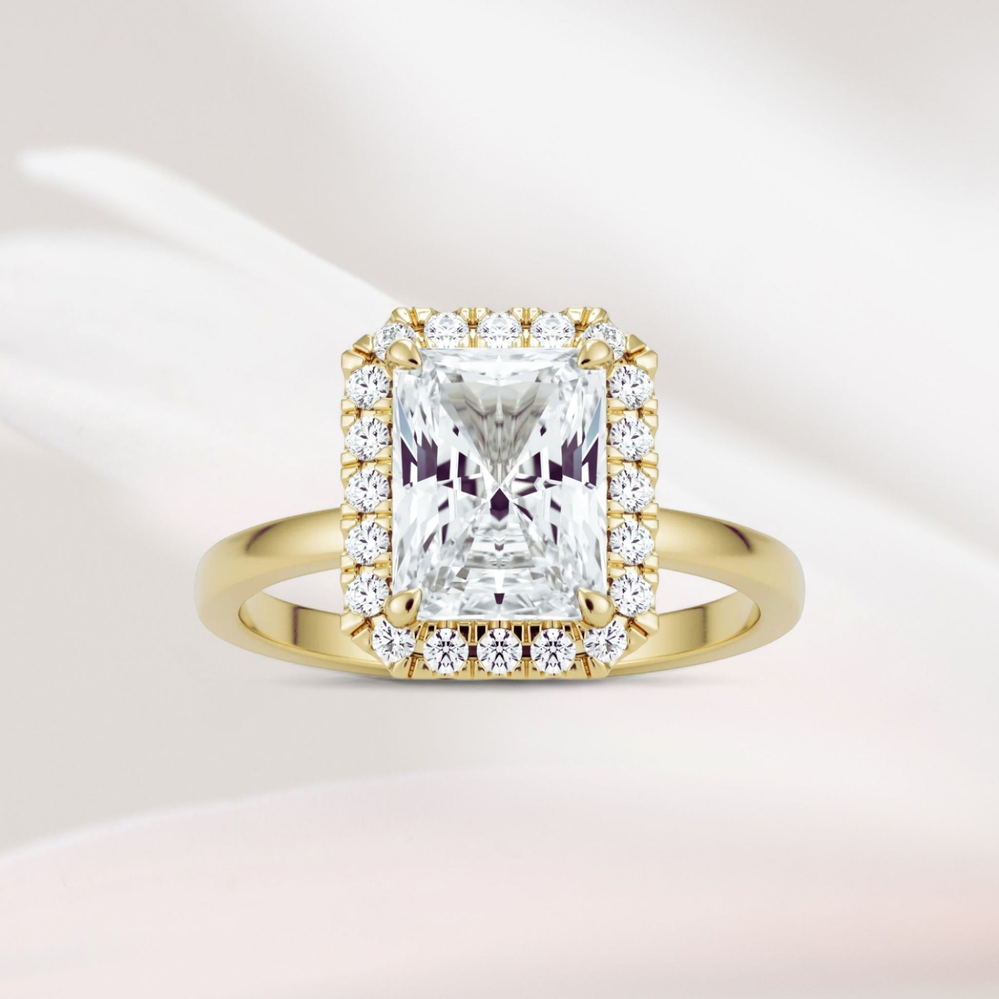 This radiant-cut halo ring exudes timeless elegance, crafted in 14K yellow gold. The dazzling center stone is framed by a halo of sparkling pavé diamonds, amplifying its brilliance. The delicate four-prong setting ensures a secure hold, while the polished gold band offers a sleek, refined finish. This ring is the epitome of sophistication, perfect for those seeking a classic yet bold statement piece. Meticulously crafted for lasting beauty, it's a treasure for any occasion.