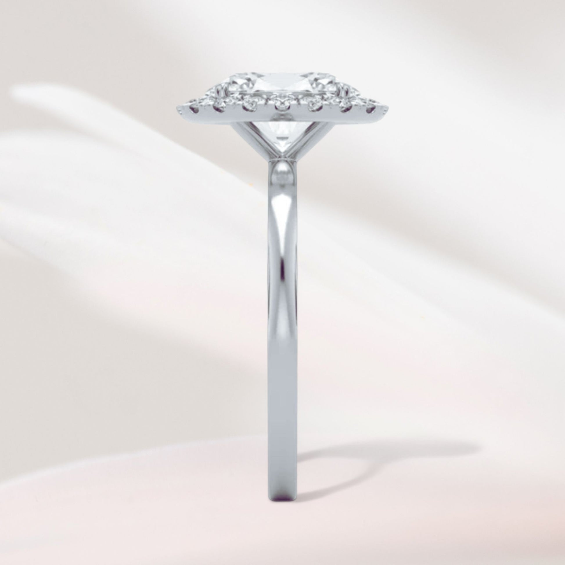 Amaral Halo Oval -valkokultasormus huokuu eleganssia, ja sen keskipisteenä on loistava ovaalinmuotoinen moissaniitti, jota ympäröi upea halo pienemmistä kivistä. Keskikivi, jonka D-väri ja VVS1-kirkkaus tekevät siitä poikkeuksellisen, on turvallisesti kiinnitetty nelipiikkiseen istutukseen, kun taas halo tuo lisää säihkettä ja hienostuneisuutta. 1,8 mm leveä valkokultainen nauha täydentää sormuksen hienostuneen estetiikan. Ajaton muotoilu ja moissaniitin 9,5 kovuus tekevät siitä täydellisen valinnan kestävälle rakkauden symbolille.