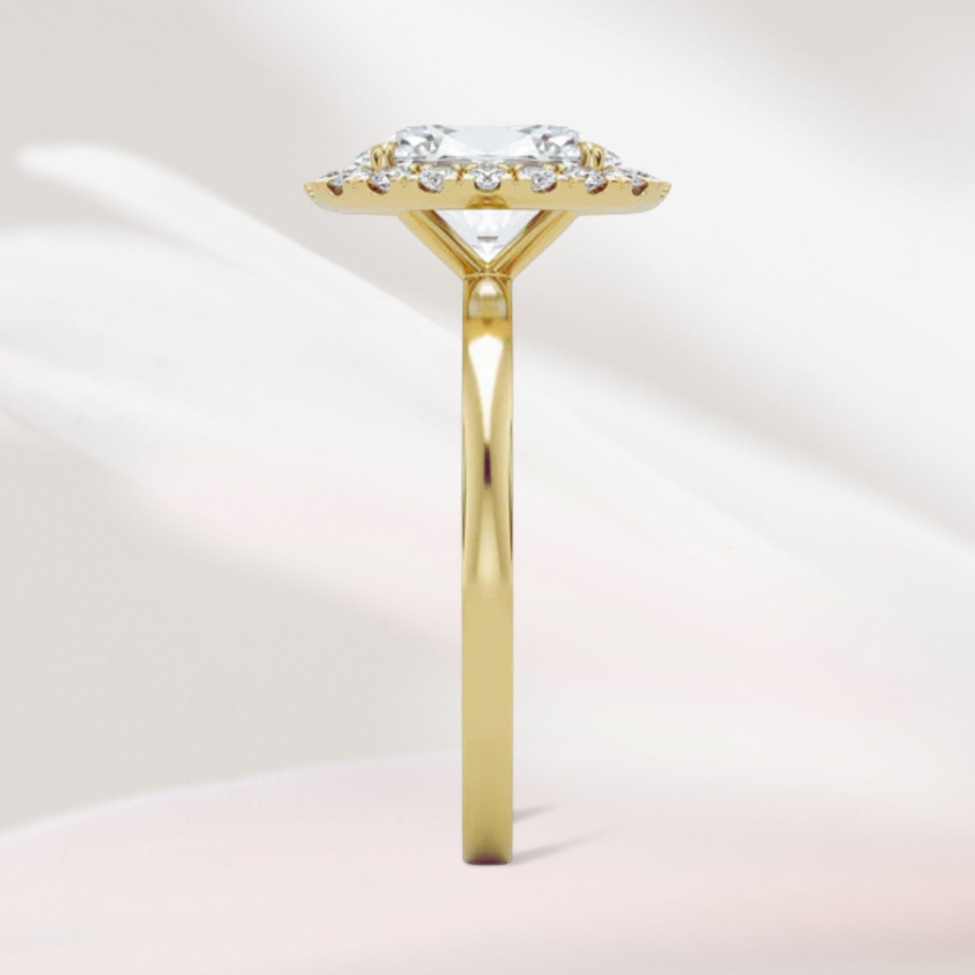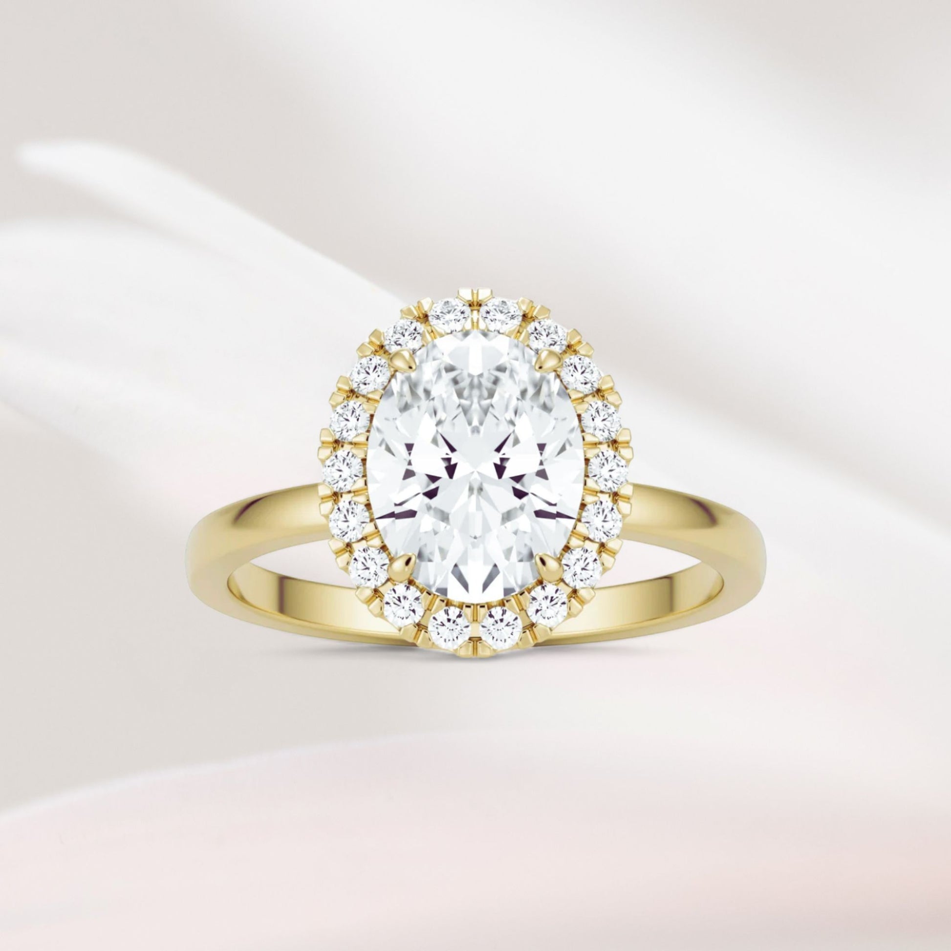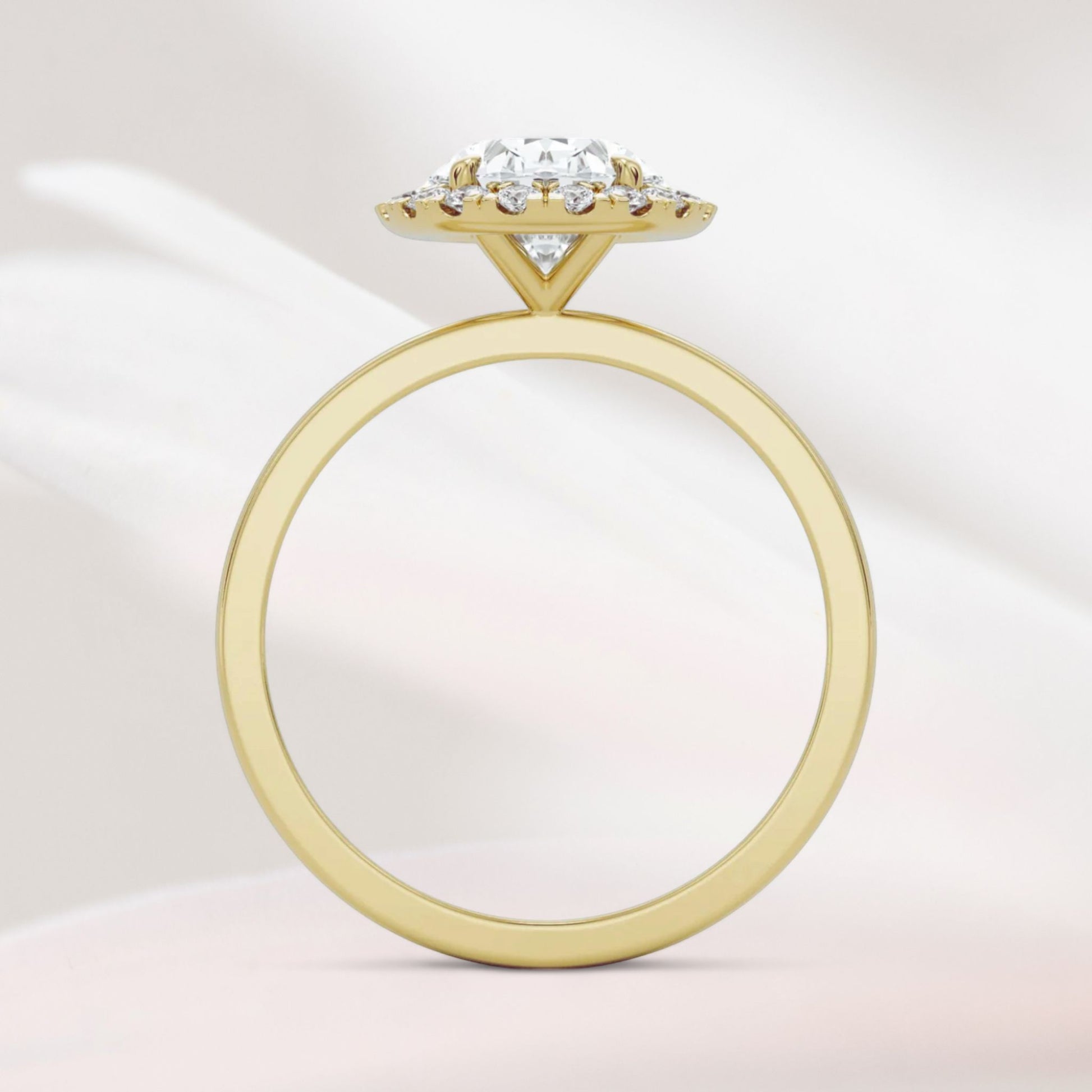 Halo Oval -sormus keltakullasta yhdistää eleganssin ja loiston, ja sen keskipisteenä on ovaalinmuotoinen moissaniitti, jota kehystää säihkyvä halo pienemmistä moissaniiteista. Ylellinen keltakultainen nauha täydentää loistavia kiviä, luoden klassisen mutta modernin muotoilun. Sormuksessa on poikkeuksellinen moissaniitti, jonka D-väri, VVS1-kirkkaus ja erinomainen hionta tarjoavat säihkettä, joka kilpailee timanttien kanssa. 1,8 mm leveä nauha ja turvallinen piikki-istutus viimeistelevät hienostuneen ja ajattoman ilmeen, täydellinen kihloihin tai erityisiin tilaisuuksiin.
