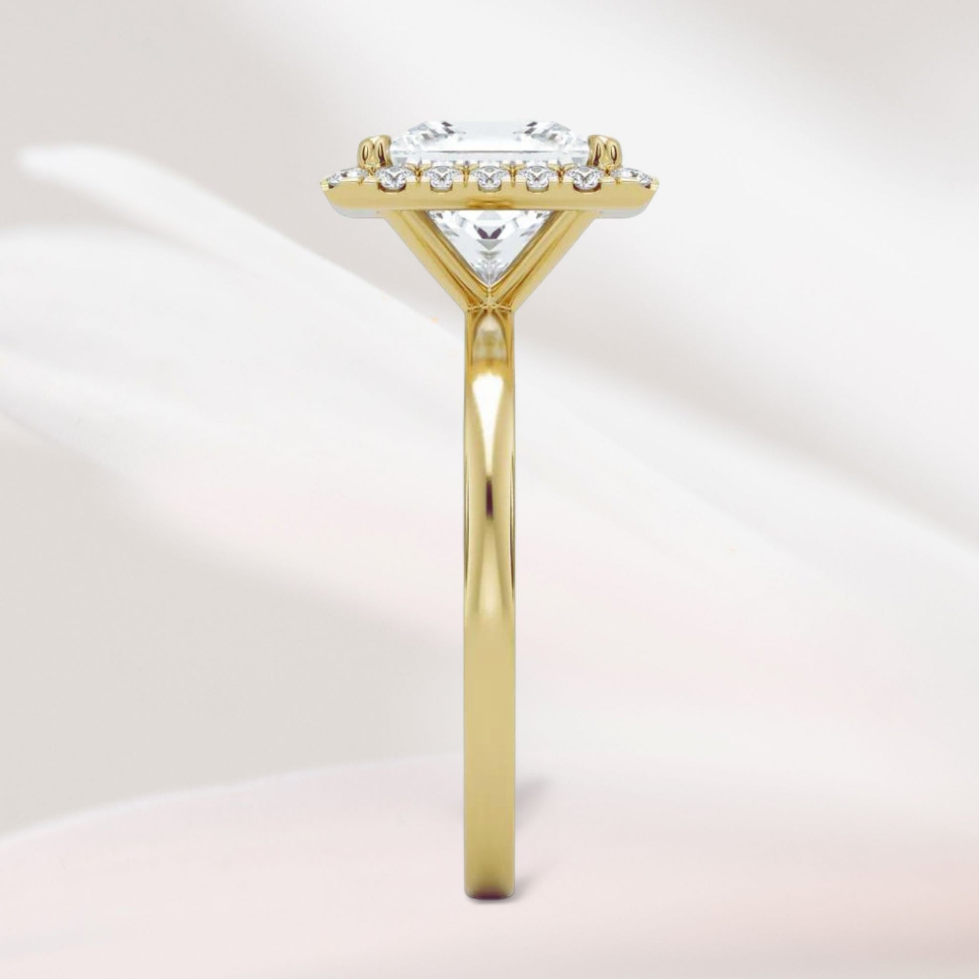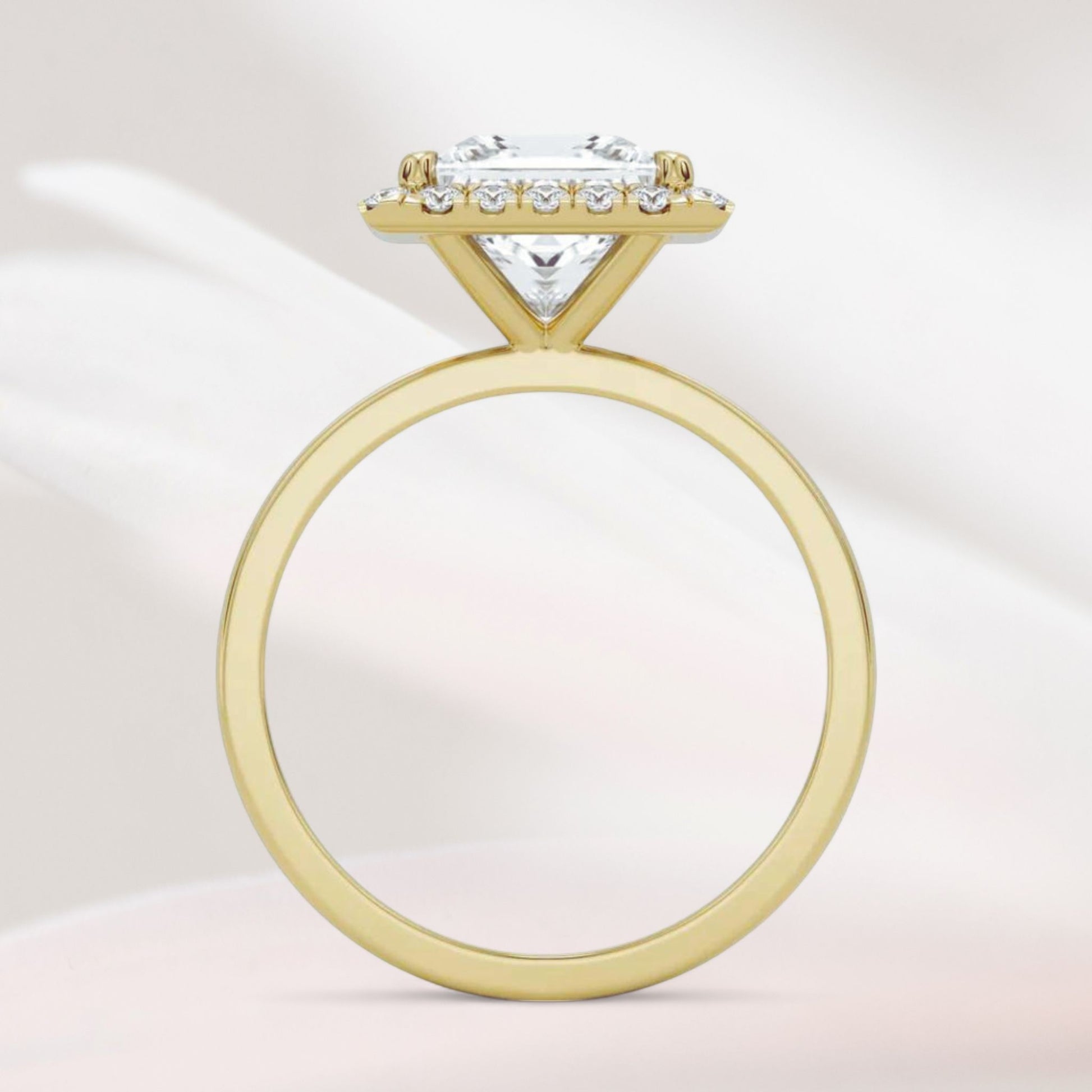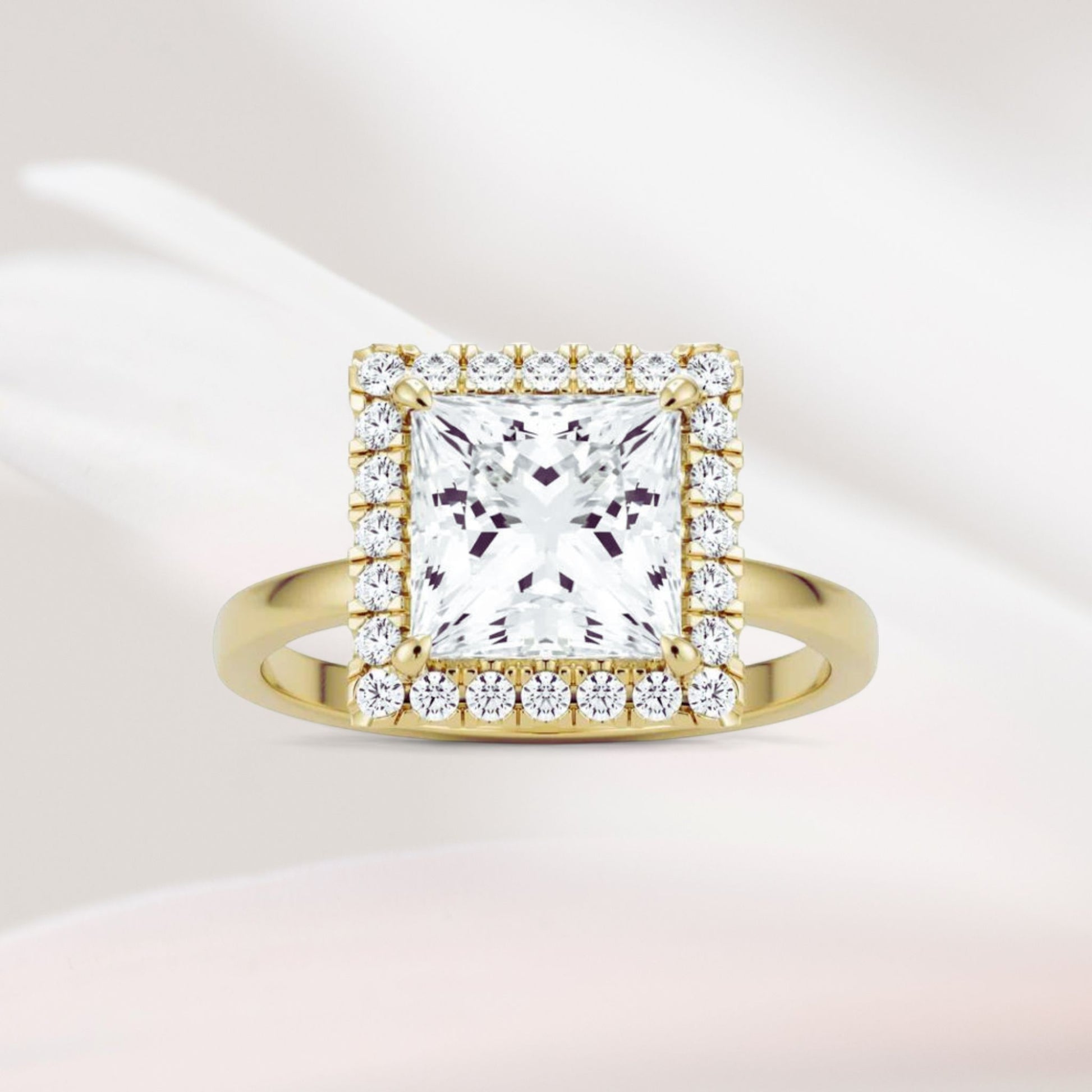 Tämä Halo Princess -sormus keltakullasta huokuu ajatonta hienostuneisuutta. Siinä on upea D-värinen, VVS1-kirkas prinsessahiottu moissaniitti, joka on asetettu ylelliseen keltakultaiseen nauhaan. Keskuskiveä ympäröi säihkyvä halo pienemmistä kivistä, mikä korostaa sen loistoa. Kovuusluokituksella 9,5 tämä sormus takaa kestävyyden säilyttäen elegantin ulkonäkönsä. Piikki-istutettu halo tarjoaa hienostuneen kontrastin sileälle nauhalle, tarjoten sekä tyyliä että pitkäkestoista kauneutta.
