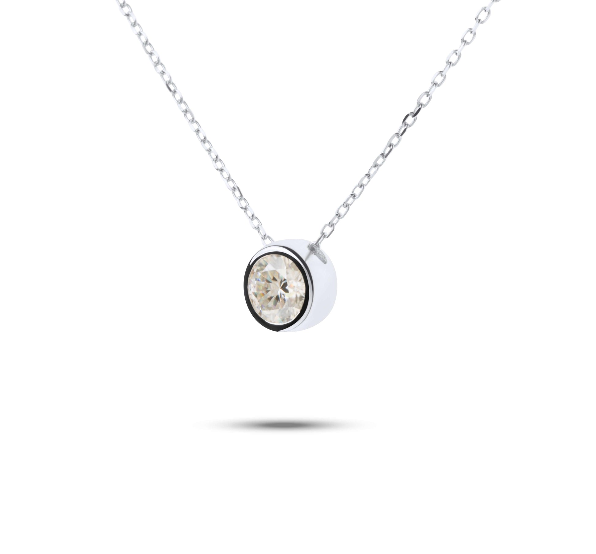 Lisää ripaus eleganssia tyyliisi pyöreällä, erinomaisesti leikatulla moisaniittiriipuksellamme. Ammattitaidolla leikattu ja turvallisessa kehysistutuksella kiinnitetty moissaniittikivi säteilee vertaansa vailla olevaa loistoa ja kimallusta. Tämä hienostunut koru on suunniteltu niin, että hienovarainen ketju kulkee kehyksen läpi, luoden saumattoman ja modernin ilmeen.