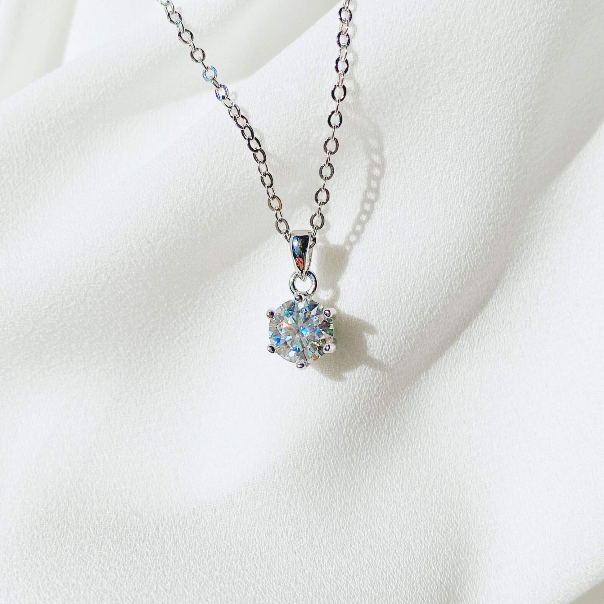 Tämä kaulakoru esittelee kimaltavan kuuden piikin moisaniittiriipuksen, joka säteilee huippuluokan loistoa ja kiiltoa. Riipus roikkuu tyylikkäästi mukavasta ketjusta, joka on suunniteltu kestämään koko päivän, olipa kyseessä sitten erityinen tilaisuus tai tavallinen arkipäivä.