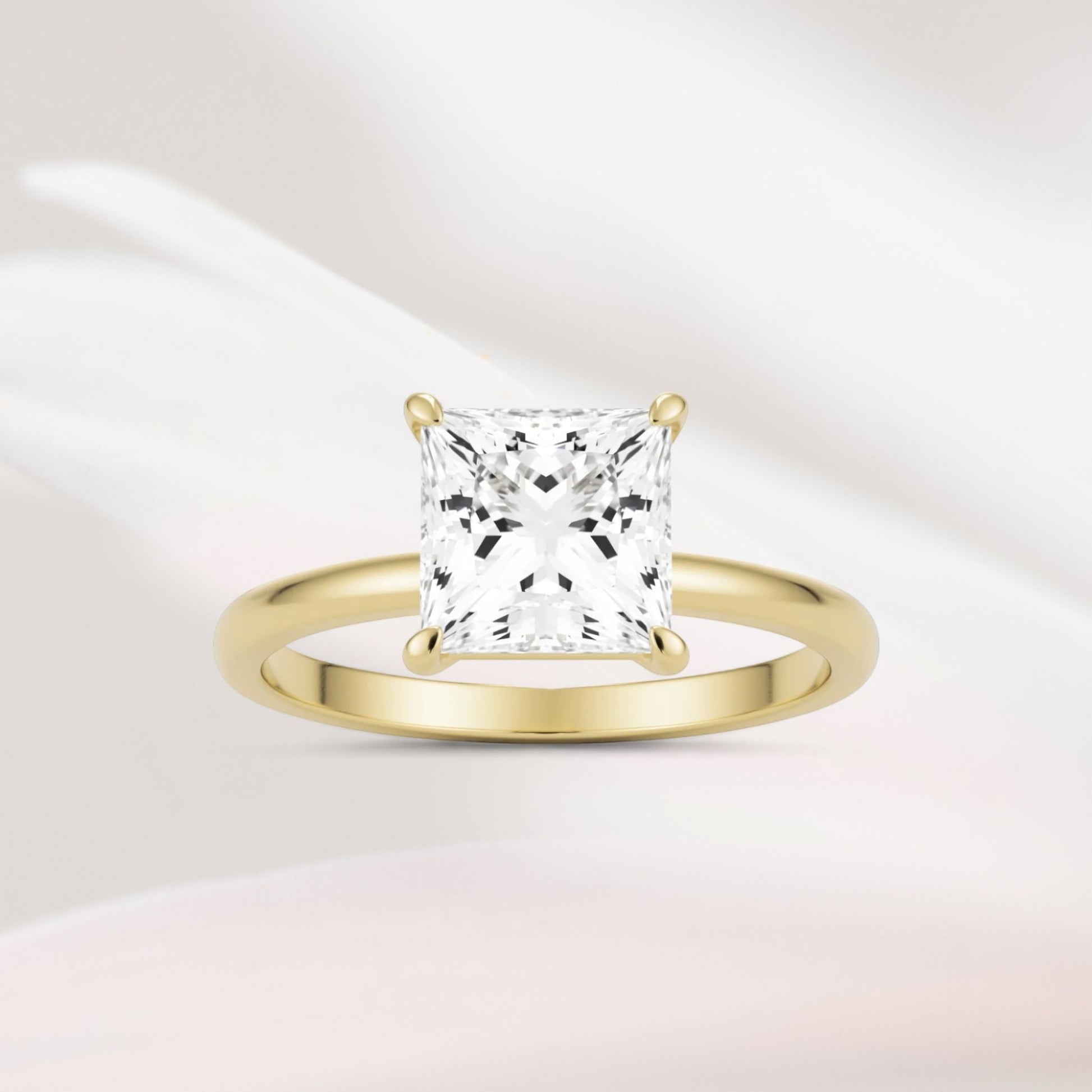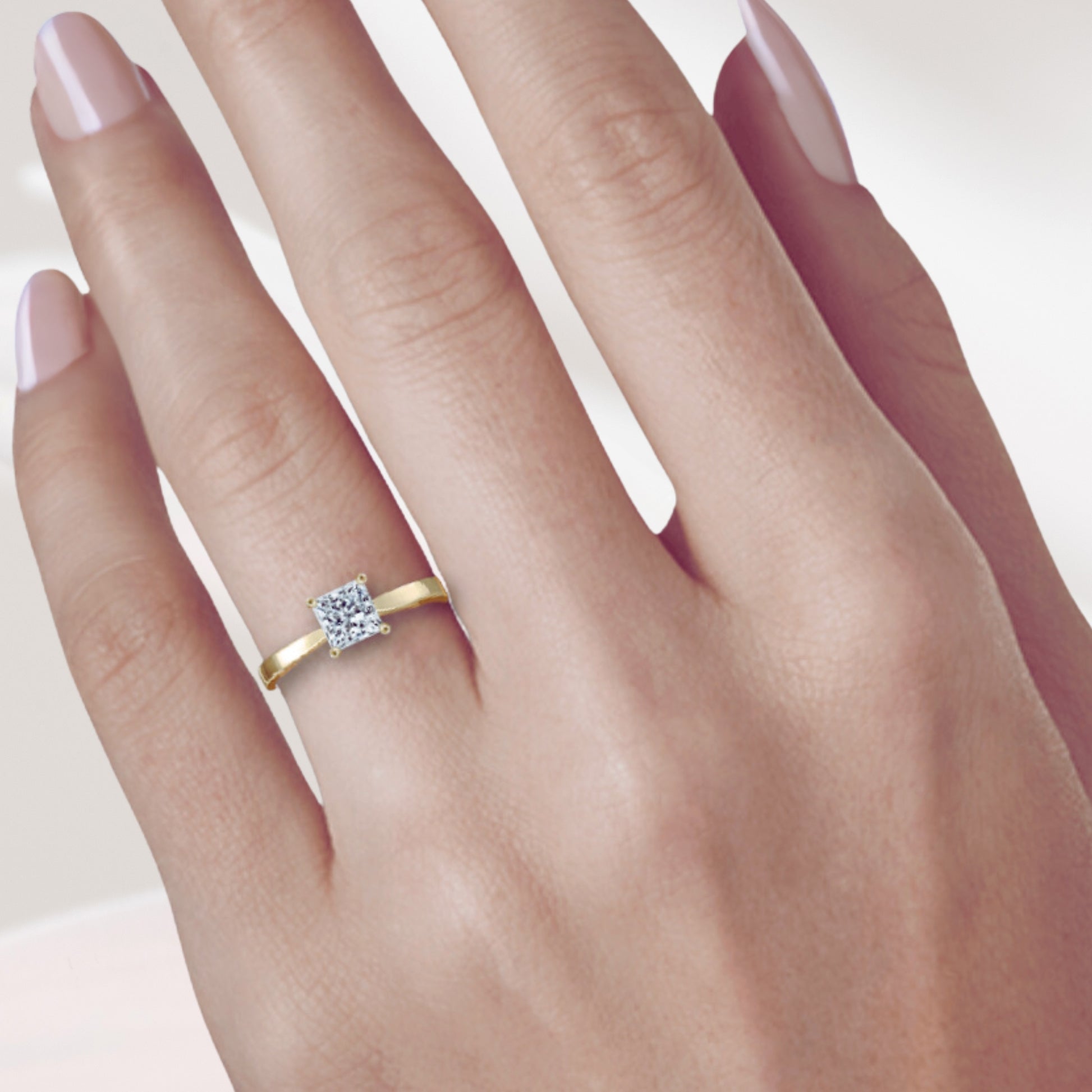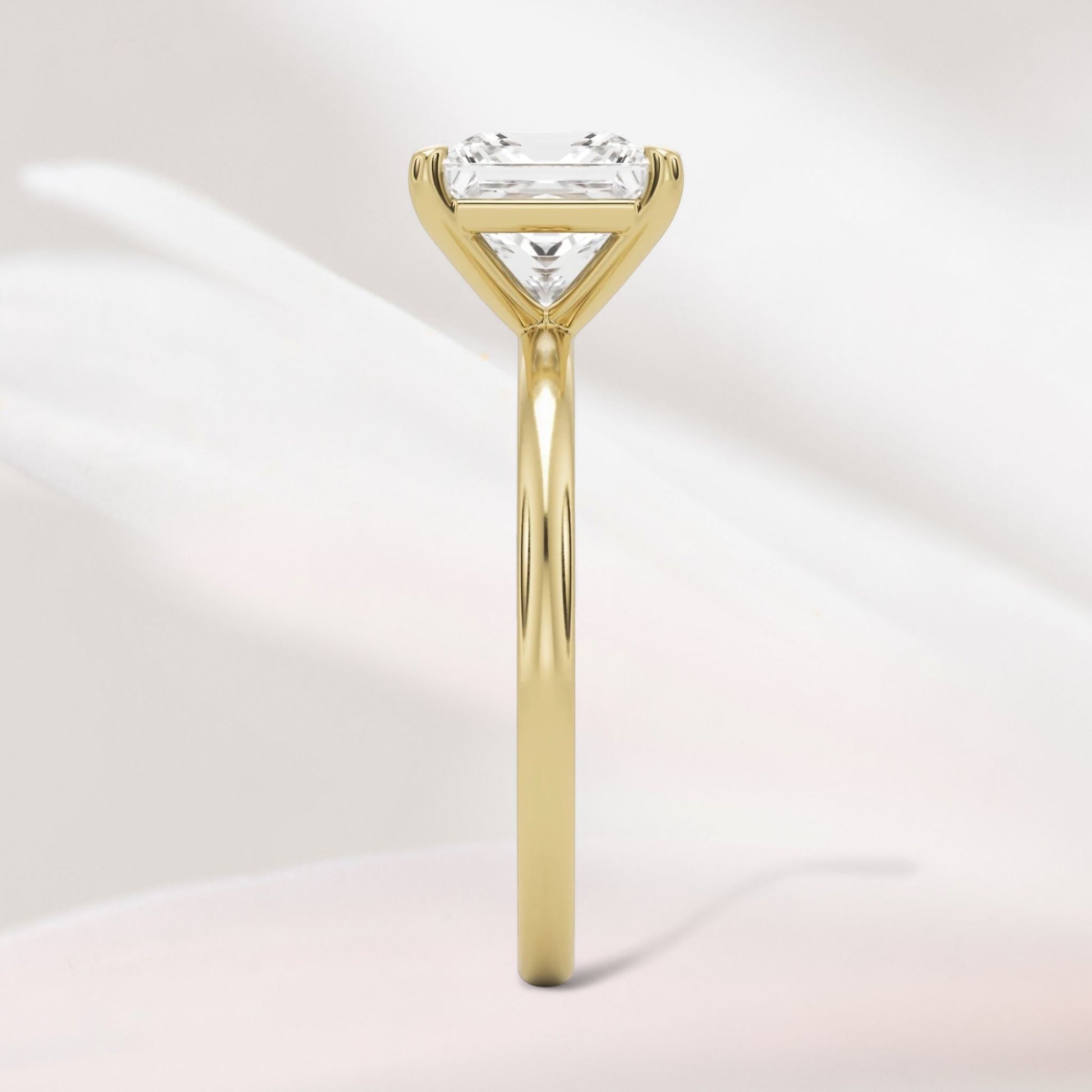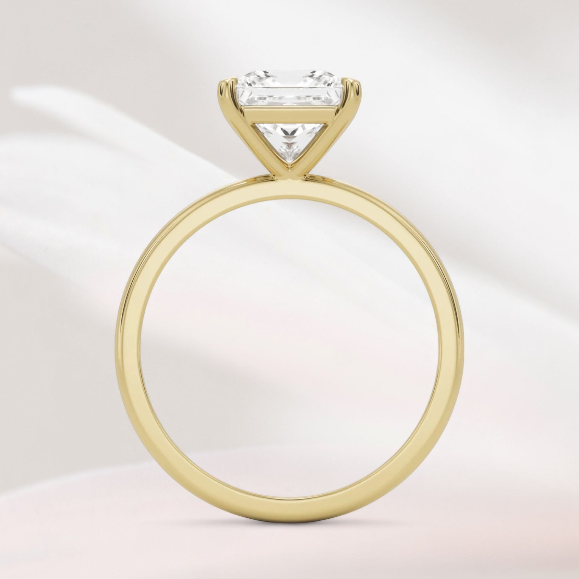 Solitaire Square -nelipiikkinen sormus keltakullasta huokuu hienostunutta eleganssia, ja sen keskipisteenä on lumoava neliöhiottu moissaniitti. Klassinen nelipiikkinen istutus korostaa kiven loistoa ja kirkkauden (D-väri, VVS1-kirkkaus) erinomaisen hionnan ansiosta. Moissaniitti on turvallisesti kiinnitetty, mikä mahdollistaa valon maksimaalisen heijastuksen ja upean säihkeen. Yhdistettynä siroon keltakultaiseen sormukseen tämä sormus tarjoaa ajattoman kauneuden, tehden siitä täydellisen valinnan kihloihin tai erityisiin hetkiin, yhdistäen ylellisyyden ja kestävyyden.
